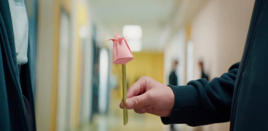 若いヒロインは彼女の新しい友人を助け、彼は彼女のために立ち上がり、この幼少期の絆は大人のラブストーリーに成長する。 飛行機のシーンでは、大人になったヒロインが「チューリップ」というタイトルのガーデニングに関する本を読む。 “それは彼らと彼らの共有ストーリーにとって意味深いシンボルです。